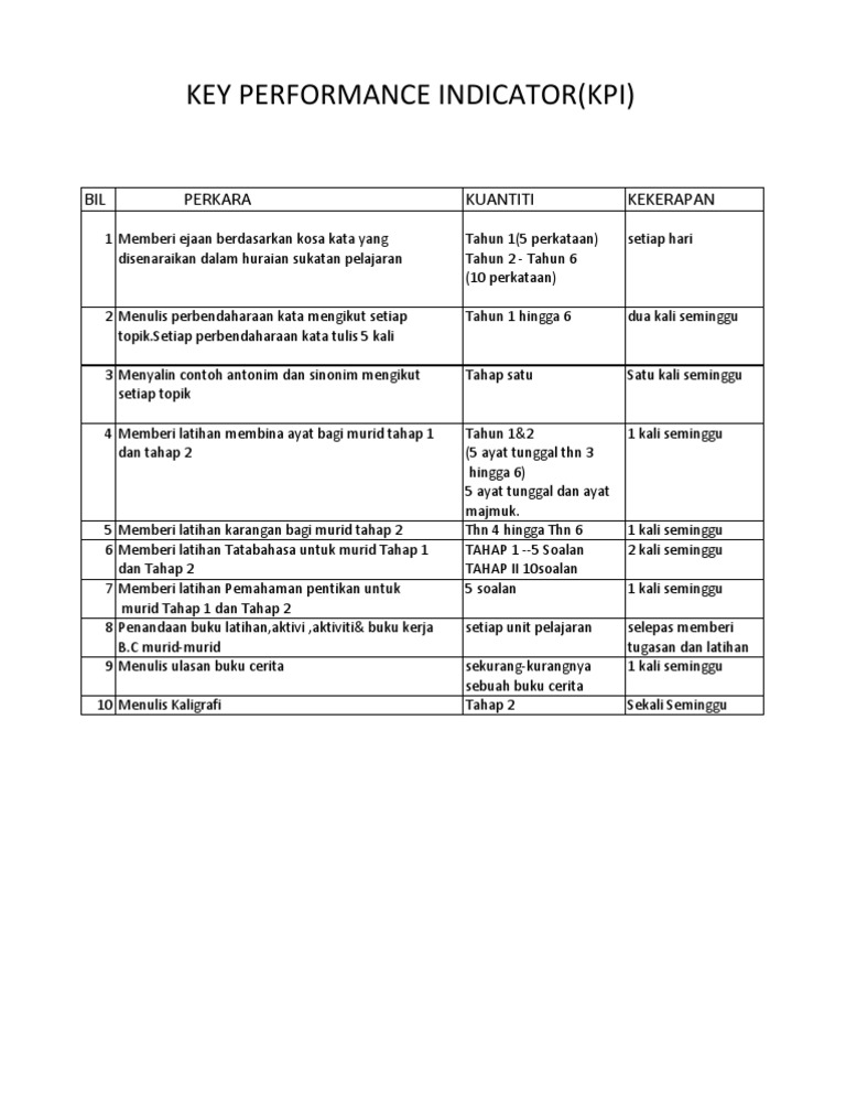 Key Performance Indicator Kpi Bil Perkara Kuantiti Kekerapan Pdf